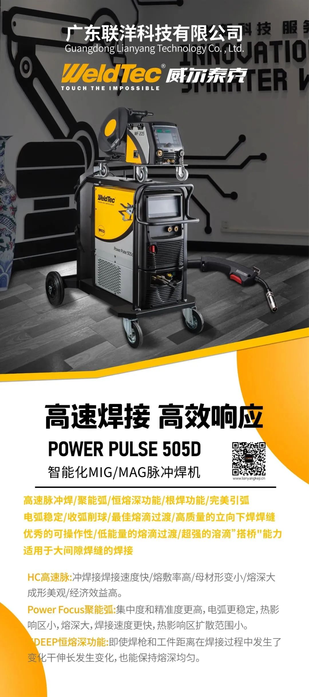 威尔泰克WeldTec 是广东联洋科技有限公司(以下简称:联洋科技)旗下的专业的工业级焊机品牌,位于国家战略要地-粤港澳大湾区几何中心-广东省中山市,是中山市国家级火炬开发区引入的国家级重点高新技术企业。 公司拥有威尔泰克WeldTec、迈格泰克MegaTec、斯巴特Smarter三大主力品牌,(三大品牌系列100多种型号产品)主营逆变直流手工弧焊机、逆变式MIG/MAG弧焊机、逆变无气自保/气保焊机、逆变空气等离子切割机、机器人焊接系统集成、数字化智能焊接设备、高效焊接系统、焊接和切割配件、焊接防护用品等产品。公司产品具有优良的品质及较高的性价比,广泛运用于电网、汽车改装、造船、钢构、煤机制造、工程机械、桥梁建筑等行业。 联洋科技约有1000名员工,公司产品全球化销售,业务遍及国内绝大部分省份以及欧洲、北美、中东、中亚及东南亚50多个国家和地区,服务20多亿人口,在全球的焊机行业的领域当中颇具影响力。 联洋科技荣获得国家级重点高新技术企业称号、国际互认的管理体系认证证书、电路以及外观设计等方面的中外专利40多项。 联洋科技拥有世界领先的加工、检测设备,且加工能力和自动化水平处于行业领先地位。其中包括:日本进口全自动数控钣金加工设备(系统)、台湾进口全自动高速冲床以及智能控制纵剪机组、智能装配和在线检测等生产检测设备100余台(套)。 联洋科技的技术源于意大利,创新研发能力领先于行业标准水平。凭借与国际并肩的设计研发实力,先进的检测试验设备保证产品质量体系,成为了领先行业的焊割设备及应用解决方案的提供商,引领焊割世界进入智能化制造新时代!